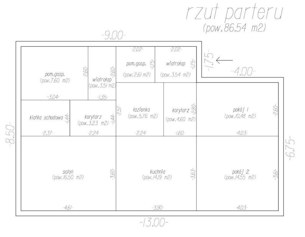 • parter: 3 pokoje, łazienka, kuchnia, kotłownia, pomieszczenie gospodarcze, wiatrołap, korytarz