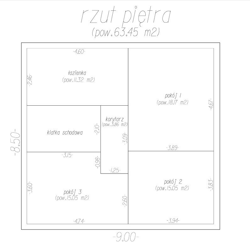 • piętro: 3 pokoje, łazienka, korytarz