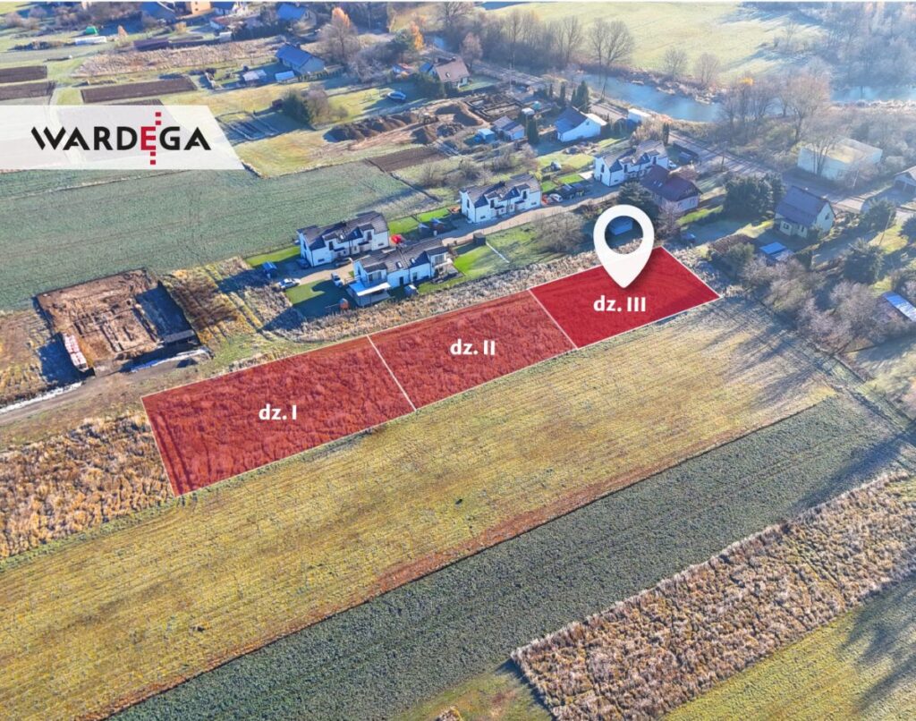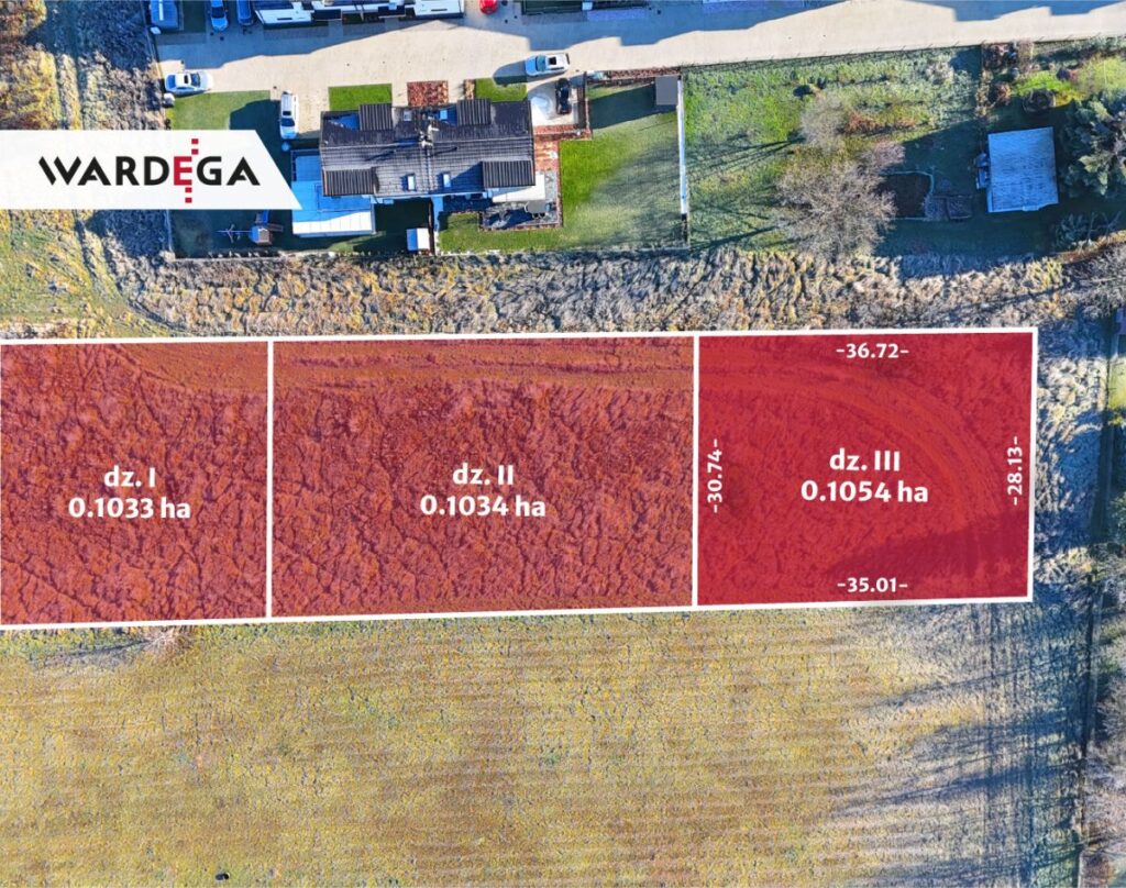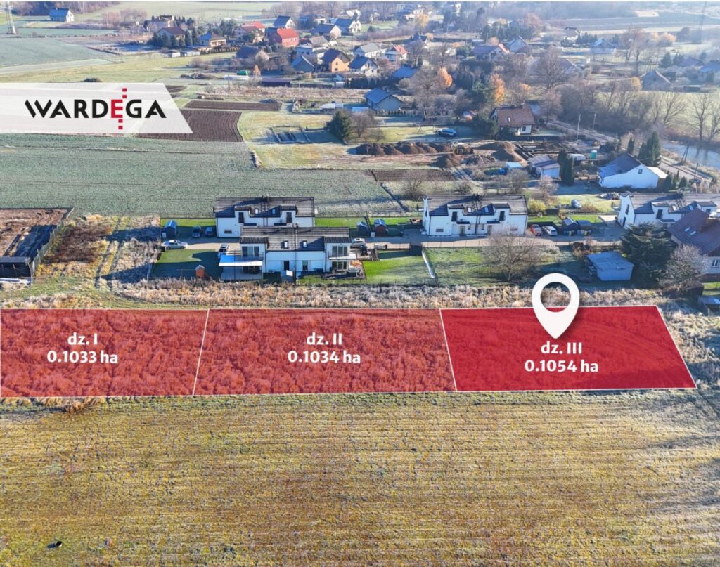 Na sprzedaż działka o powierzchni 10.54 a (dz. III) - oznaczona w miejscowym planie zagospodarowania przestrzennego jako tereny mieszkalnictwa jednorodzinnej (20MN3), który zakłada budynki mieszkalne jednorodzinne w zabudowie wolnostojącej i bliźniaczej oraz zakaz lokalizacji w zabudowie szeregowej. Działka w kształcie trapezu o wymiarach ok. 30.70x36.70x28.10x35 m. Dojazd nieutwardzoną drogą wewnętrzną. Możliwość zakupu dwóch działek sąsiednich, każda po ok. 10 a.
